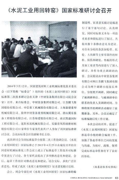 2014年3月12日,國家建筑材料工業(yè)機械標準化技術(shù)委員會組織的國家標準第二次技術(shù)研討會在天津召開。江蘇鵬飛集團股份有限公司等11家單位專家及代表共17人參加了該國家標準研討會議。