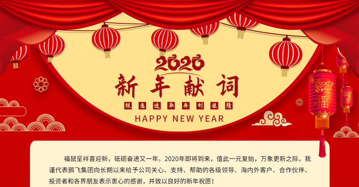 福鼠呈祥喜迎新,砥礪奮進又一年。2020年即將到來,值此一元復始,萬象更新之際,我謹代表鵬飛集團向長期以來給予公司關(guān)心、支持、幫助的各級領(lǐng)導、海內(nèi)外客戶、合作伙伴、投資者和各界朋友表示衷心的感謝,并致以良好的新年祝愿!