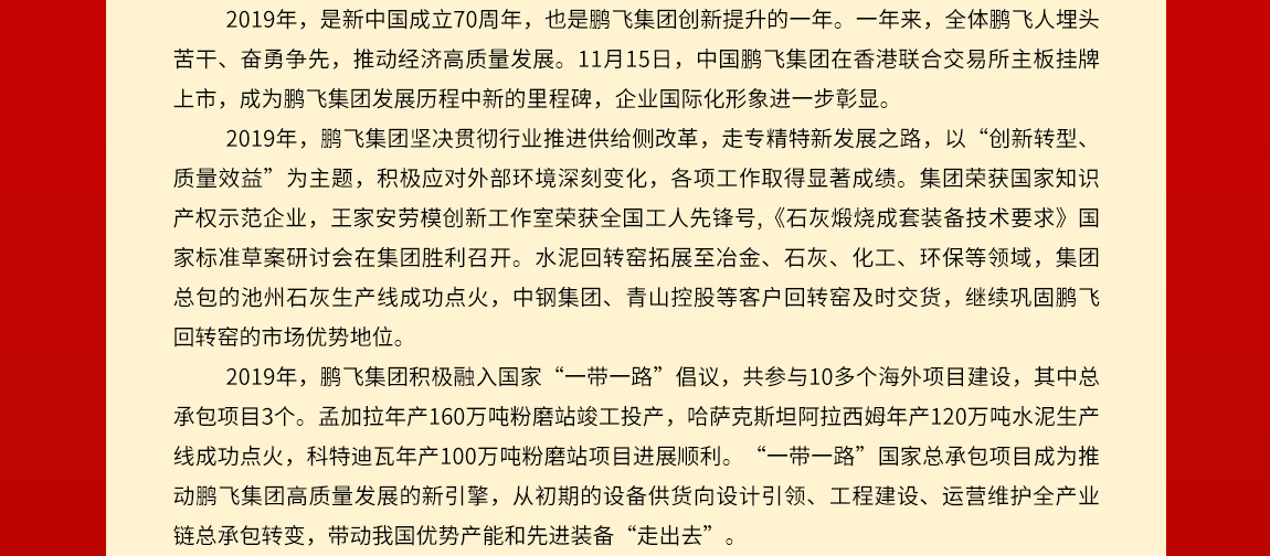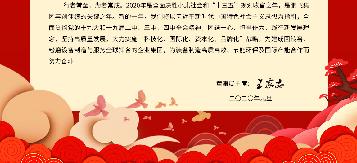 行者常至,為者常成。2020年是全面決勝小康社會和“十三五”規(guī)劃收官之年,是鵬飛集團再創(chuàng)佳績的關(guān)鍵之年。新的一年,我們將以習近平新時代中國特色社會主義思想為指引,全面貫徹黨的十九大和十九屆二中、三中、四中全會精神,團結(jié)一心、擔當作為,踐行新發(fā)展理念,堅持高質(zhì)量發(fā)展,大力實施“科技化、國際化、資本化、品牌化”戰(zhàn)略,為建成回轉(zhuǎn)窯、粉磨設(shè)備制造與服務(wù)全球知名的企業(yè)集團,為裝備制造高質(zhì)高效、節(jié)能環(huán)保及國際產(chǎn)能合作而努力奮斗!