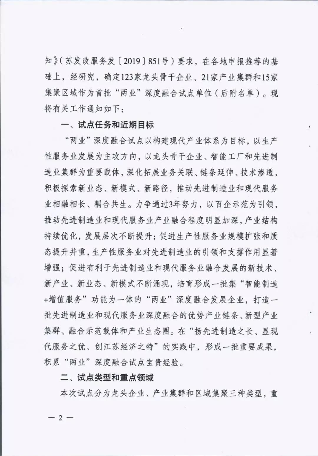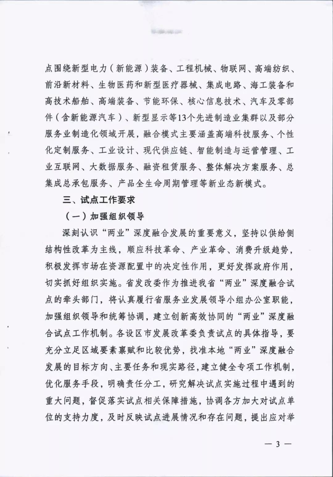 為貫徹落實(shí)中央深改委第十次會議精神、國家發(fā)改委等部門《關(guān)于推動先進(jìn)制造業(yè)和現(xiàn)代服務(wù)業(yè)深度融合發(fā)展的實(shí)施意見》(發(fā)改產(chǎn)業(yè)〔2019〕1762號)和省委省政府部署要求,進(jìn)一步推動先進(jìn)制造業(yè)和現(xiàn)代服務(wù)業(yè)深度融合發(fā)展,我省啟動開展了江蘇省先進(jìn)制造業(yè)和現(xiàn)代服務(wù)業(yè)深度融合試點(diǎn)推薦申報(bào)和遴選工作。根據(jù)《省發(fā)展改革委關(guān)于組織開展江蘇省先進(jìn)制造業(yè)和現(xiàn)代服務(wù)業(yè)深度融合試點(diǎn)工作的通知》(蘇發(fā)改服務(wù)發(fā)〔2019〕851號)要求,在各地申報(bào)的基礎(chǔ)上研究確定123家龍頭骨干企業(yè)、21家產(chǎn)業(yè)集群和15家集聚區(qū)域作為首批“兩業(yè)”深度融合試點(diǎn)單位。我市江蘇鵬飛集團(tuán)股份有限公司大型成套裝備總集成總承包融合試點(diǎn)、鑫緣繭絲綢集團(tuán)股份有限公司繭絲綢全產(chǎn)業(yè)鏈產(chǎn)品生命周期管理融合試點(diǎn)、中國天楹股份有限公司智慧城市環(huán)境管理系統(tǒng)應(yīng)用總集成總承包融合試點(diǎn)共三家企業(yè)入選試點(diǎn)名單。