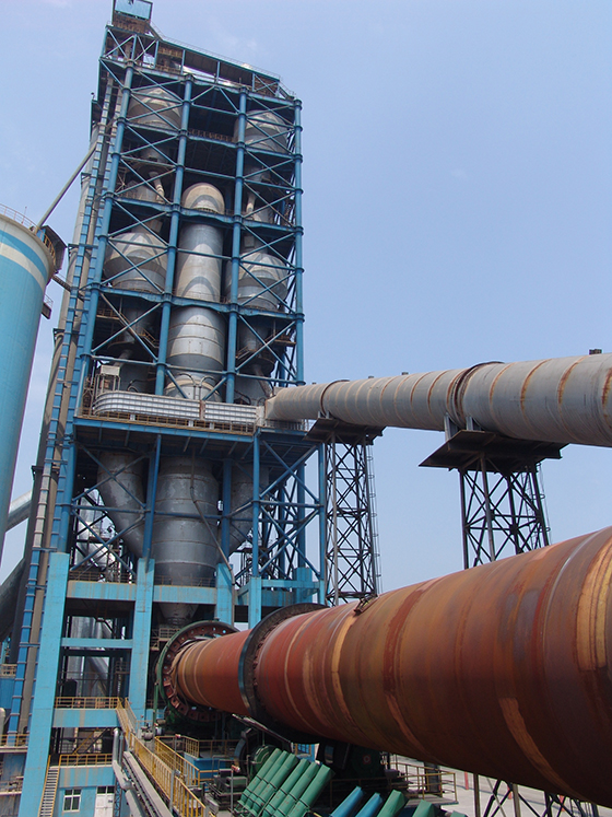回轉(zhuǎn)窯是由鋼板卷制的圓筒,內(nèi)砌耐火磚,由裝車簡體上的輪帶和下面的托輪支承,用裝在窯身上的大齒圈傳動(dòng)。回轉(zhuǎn)窯通常以3.5%的斜度安放,轉(zhuǎn)數(shù)一般在1轉(zhuǎn)/分鐘以內(nèi)、新式干法窯可達(dá)3轉(zhuǎn)/分鐘以上。單筒冷卻機(jī)與窯相似,不同的是筒內(nèi)裝有揚(yáng)料板用以加速熟料冷卻。窯頭高溫區(qū)簡體溫度過高,以前曾用水冷卻,現(xiàn)已改為用風(fēng)冷卻。