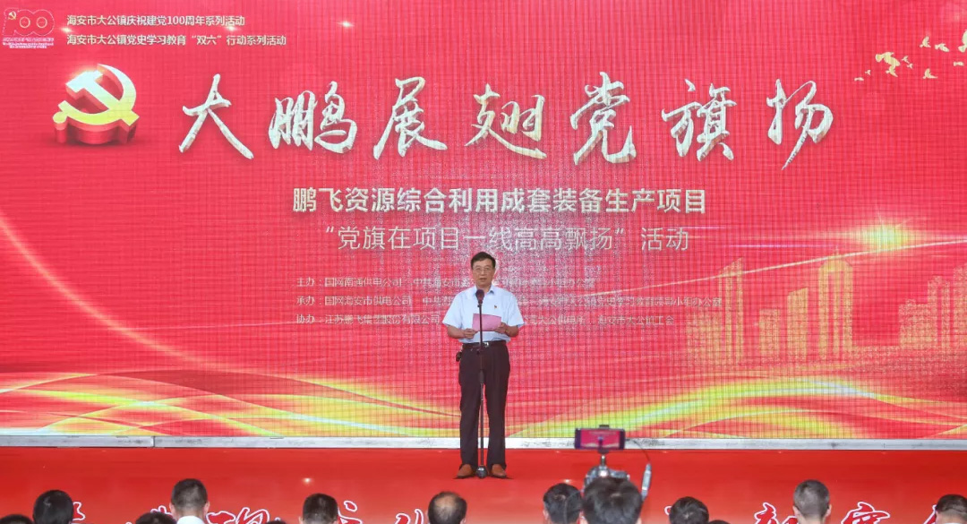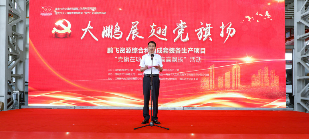 “今天活動(dòng)現(xiàn)場(chǎng)的‘鵬飛資源綜合利用成套裝備生產(chǎn)項(xiàng)目’是2021年江蘇省重大項(xiàng)目,南通市‘黨旗在項(xiàng)目一線高高飄揚(yáng)’活動(dòng)第一批啟動(dòng)項(xiàng)目。為了著力提升服務(wù)效能,健全重大項(xiàng)目服務(wù)機(jī)制,大公鎮(zhèn)牽頭組織成立項(xiàng)目臨時(shí)黨支部、項(xiàng)目服務(wù)專班,一刻不停推項(xiàng)目,讓黨旗飄揚(yáng)在項(xiàng)目一線;一著不讓抓發(fā)展,讓黨員沖鋒在項(xiàng)目一線;一以貫之優(yōu)環(huán)境,讓服務(wù)下沉到項(xiàng)目一線,著力辦實(shí)事、解難題,為推進(jìn)重大項(xiàng)目建設(shè)提供有力支撐和堅(jiān)實(shí)保障。”大公鎮(zhèn)黨委書(shū)記金山存說(shuō)。
