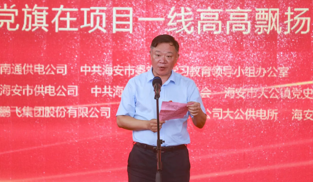 國(guó)網(wǎng)南通供電公司副總經(jīng)理李秋實(shí),海安市委常委、宣傳部部長(zhǎng)王榮貴,海安市委組織部副部長(zhǎng)、“兩新”工委書(shū)記吳蘭,海安市委宣傳部常務(wù)副部長(zhǎng)劉萬(wàn)春,海安市委宣傳部副部長(zhǎng)、新聞出版局局長(zhǎng)陳琳,國(guó)網(wǎng)海安市供電公司總經(jīng)理唐玉婷,海安市發(fā)改委黨組成員、工信局專職副局長(zhǎng)陳皞,鵬飛集團(tuán)黨委書(shū)記、董事長(zhǎng)王家安,大公鎮(zhèn)黨委書(shū)記金山存,大公鎮(zhèn)黨委副書(shū)記、鎮(zhèn)長(zhǎng)魯競(jìng)共同啟動(dòng)“黨旗在項(xiàng)目一線高高飄揚(yáng)”活動(dòng)。