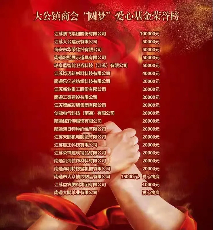 海安市政協(xié)副主席、市工商聯(lián)主席蔡祝平,大公商會會長、鵬飛集團董事長王家安共同為愛心基金揭牌,宣布大公鎮(zhèn)商會“圓夢”愛心基金正式成立!前期,大公鎮(zhèn)商會21家副會長單位共計籌集60.5萬元愛心善款,所募集資金主要用于:幫助困境青少年、開展青少年公益實踐等活動。