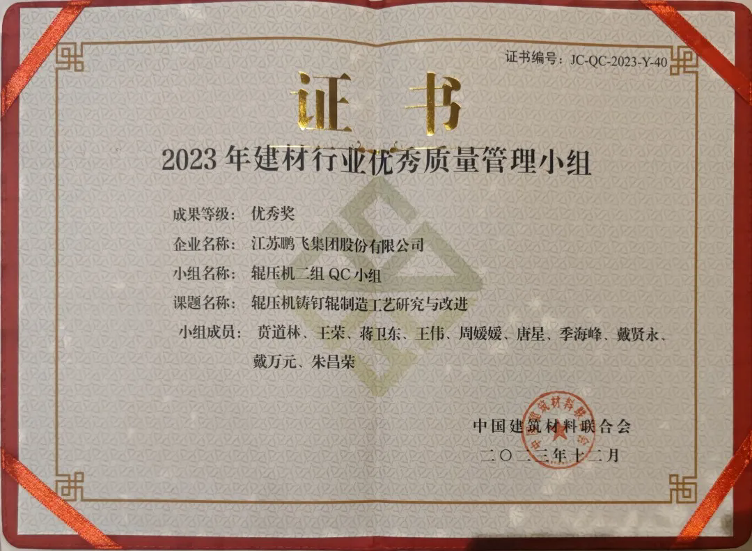 近期,中國(guó)建筑材料聯(lián)合會(huì)組織召開第三十九次建材行業(yè)質(zhì)量管理小組代表大會(huì)暨質(zhì)量信得過班組經(jīng)驗(yàn)交流大會(huì),會(huì)上頒發(fā)了2023年建材行業(yè)優(yōu)秀質(zhì)量管理小組和質(zhì)量信得過班組、先進(jìn)個(gè)人和優(yōu)秀組織榮譽(yù)證書。鵬飛金工大齒輪“三合三分”加工工法獲得“2023年建材行業(yè)優(yōu)秀質(zhì)量管理小組三等獎(jiǎng)”;輥壓機(jī)二組QC小組的輥壓機(jī)鑄釘輥制造工藝研究與改進(jìn)獲得“2023年建材行業(yè)優(yōu)秀質(zhì)量管理小組優(yōu)秀獎(jiǎng)”,同時(shí)QC小組獲評(píng)“我最喜愛的質(zhì)量管理小組”。