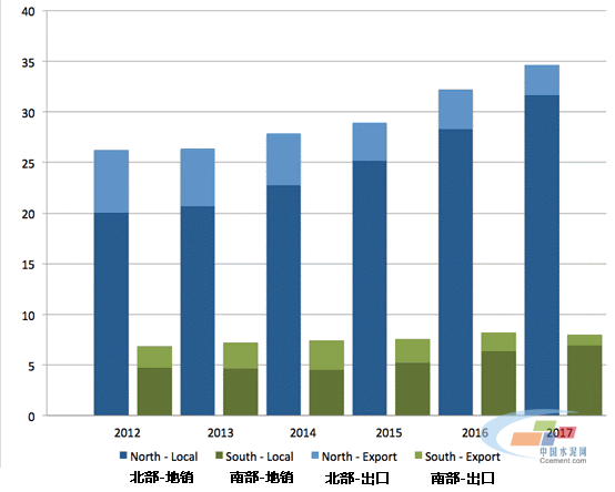 上圖展現(xiàn)了巴基斯坦國(guó)內(nèi)水泥行業(yè)的現(xiàn)狀,巴基斯坦的年度水泥消費(fèi)量從2012年的3310萬噸增長(zhǎng)到了2017年的4280萬噸,增長(zhǎng)幅度在30%左右,其中五分之四的水泥消費(fèi)集中在巴基斯坦的北部地區(qū)。與此同時(shí),更重要的是,巴基斯坦的出口水泥從2013年的830萬噸降低到了2017年的420萬噸。造成這一現(xiàn)象的主要原因是阿富汗市場(chǎng)的下跌,以及水性熟料出口量的減少。考慮到南方市場(chǎng)的出口水泥比例較高,盡管水泥總消費(fèi)量在增長(zhǎng),但是出口量的減少對(duì)南方可能會(huì)造成更大的打擊。2018年到目前為止,類似的趨勢(shì)依然存在,唯一有所改變的是南方熟料出口量的在今年有反彈的跡象。