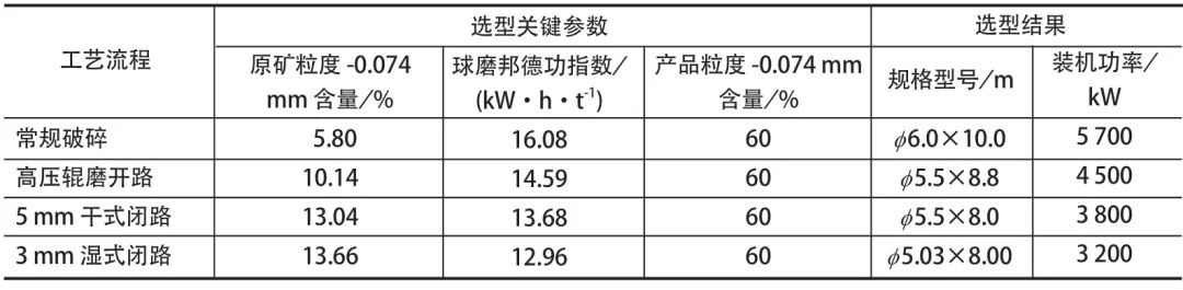 /d、磨礦產(chǎn)品粒度 -0.074 mm 占 60% 情況下,由于不同輥壓工藝下原礦粒度 -0.074 mm 含量和球磨機邦德功指數(shù)的差異,一段球磨機選型規(guī)格存在明顯區(qū)別。常規(guī)流程需 1 臺