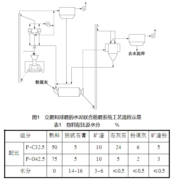 淶水冀東水泥有限公司3個(gè)水泥粉磨系統(tǒng)均采用JLMS-24.3立磨與Φ4.8m×9.5m球磨機(jī)組成聯(lián)合粉磨系統(tǒng)。JLMS-24.3立磨裝機(jī)功率2240kW,磨盤中徑2400mm,3個(gè)磨輥,磨盤轉(zhuǎn)速33.58r/min,產(chǎn)量210t/h,入料粒度≤30mm;配套選粉機(jī)JXF4100GY,成品量180~220t/h,比表面積≥200m2/kg,最大喂料量600t/h,通過氣體溫度≤150℃,通風(fēng)量(70~90℃)180000m3/h;球磨機(jī)Φ4.8m×9.5m,裝機(jī)功率3550kW,產(chǎn)量180t/h,生產(chǎn)P·O42.5水泥時(shí),比表面積360~380 m2/kg;配套O-Sepa選粉機(jī),通風(fēng)量240000m3/h,最大通過量720t/h。水泥粉磨系統(tǒng)工藝流程見圖1,系統(tǒng)設(shè)計(jì)指標(biāo):生產(chǎn)P·O42.5水泥,臺(tái)時(shí)產(chǎn)量180t/h,分步電耗35.5kWh/t,比表面積360m2/kg,生產(chǎn)P·C32.5水泥,臺(tái)時(shí)產(chǎn)量240t/h,分步電耗26.6kWh/t,比表面積370m2/kg。物料配比及相應(yīng)的水分情況見表1。