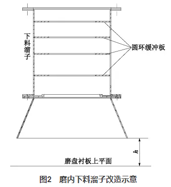一方面它降低了入磨物料高落差對(duì)溜子的沖刷,另一方面圓環(huán)的收口作用使得物料的下料點(diǎn)發(fā)生了變化,將原先的單點(diǎn)偏心下料改成接近中心下料,改善了物料在磨盤上的偏離現(xiàn)象。同時(shí),適當(dāng)調(diào)整h值的大?。ㄔO(shè)計(jì)600mm,最終改為400mm),使得下料波動(dòng)時(shí),可以起到一定的緩沖作用,穩(wěn)定料床。