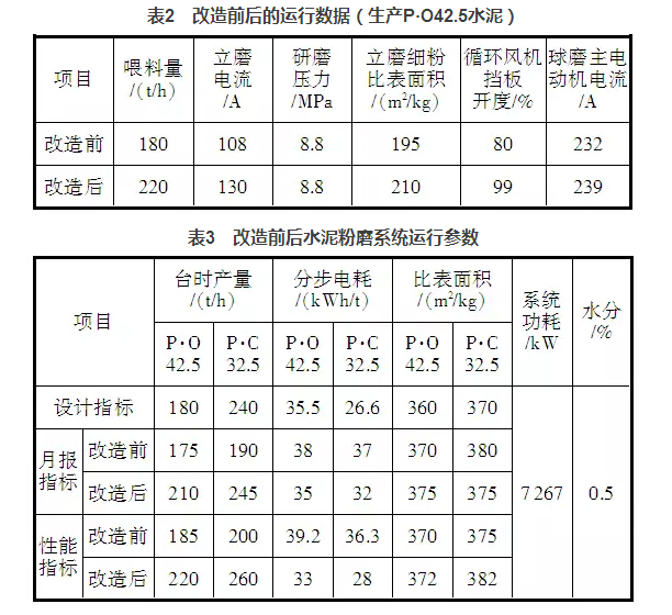通過以上幾個(gè)方面的整改,水泥粉磨系統(tǒng)的臺(tái)時(shí)產(chǎn)量有了明顯提升,表2是改造前后的運(yùn)行數(shù)據(jù),表3是水泥粉磨系統(tǒng)改造前后操作參數(shù)對(duì)照。