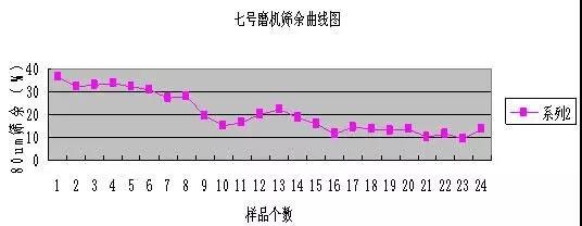 鑒于六七號磨機的狀況,我們對兩臺磨機停磨進磨觀察,六號磨機內(nèi)兩倉料球比過高,進磨后看不到鋼球,物料高出一個鋼球的高度,正常情況下鋼球應(yīng)該高出料面露出半個鋼球為最佳,隨現(xiàn)場測量計算六號磨一倉填充率為28.7%二倉為29.0%;七號磨機進磨觀察一倉鋼球露出料面一半,說明填充率應(yīng)該是可以的,測量計算一倉的填充率為31.2%二倉為29.2%;這種磨機的最佳填充率一倉為30%左右二倉為31%左右。隨取七號磨樣做了磨機的篩余曲線,磨機均采用急停的停磨方式,入磨共取樣品24個做80um和200um的篩余。見圖1。