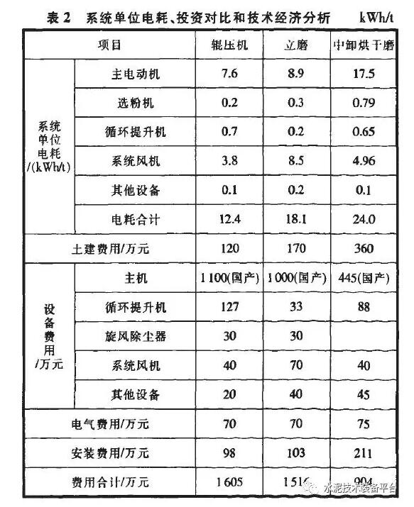 3種生料終粉磨系統(tǒng)主機(jī)設(shè)備對(duì)比見表1,單位電耗、投資及技術(shù)經(jīng)濟(jì)分析見表2。