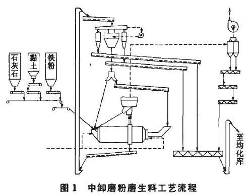 中卸烘干磨終粉磨生料工藝流程圖見圖1.
