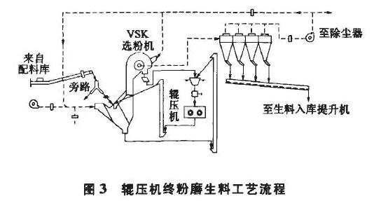 輥壓機(jī)終粉磨生料工藝流程圖見圖3.