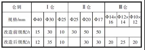 改造后磨機(jī)Ⅰ倉和Ⅱ倉仍然使用鋼球,Ⅲ倉使用微段。改造前后研磨體級配見表2。