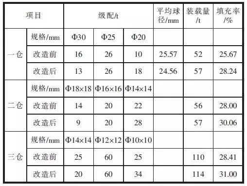 6)磨機(jī)研磨體用振動篩嚴(yán)格篩撿,淘汰不合格研磨體;人工清理隔倉板篦縫,保證磨內(nèi)每條篦縫暢通,要求達(dá)到“料走篦縫,風(fēng)走通風(fēng)圓”,避免調(diào)風(fēng)時細(xì)度跑粗或磨頭冒正壓。清理檢修后,磨主機(jī)電流由345~350A上升到355~360A,磨尾壓力由-600~-800Pa降低到-400~-600Pa。7)調(diào)整磨內(nèi)研磨體級配,提高磨機(jī)各倉填充率,降低平均球徑,增大研磨面積,從而降低物料流速,提高出磨水泥比表面積。改造前后磨內(nèi)研磨體級配情況見表2(磨機(jī)設(shè)計(jì)研磨體大裝載量235t,調(diào)整后裝載量為228t,符合設(shè)計(jì)要求)。