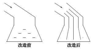 5)將V型選粉機(jī)下料溜子改為四通道下料方式,保證物料在V型選粉機(jī)內(nèi)部形成均勻料幕(見圖3),提高選粉效果,預(yù)粉磨系統(tǒng)成品物料比表面積可提高到190m2/kg以上。
