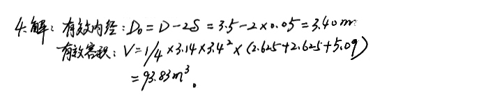 4、已知某φ3.5m磨機(jī)襯板的厚度為0.05m,一倉(cāng)長(zhǎng)2.625m,二倉(cāng)2.3625m,三倉(cāng)5.09m,求該磨機(jī)的有效內(nèi)徑和有效容積。