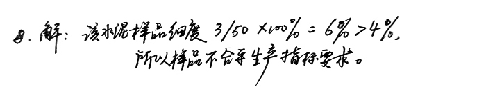 8、某廠水泥樣品50g,經(jīng)0.08mm方孔篩篩析,達(dá)到規(guī)定時(shí)間所剩料量為3g,問(wèn)該樣品是否合乎生產(chǎn)指標(biāo)要求?(要求水泥細(xì)度<4%)